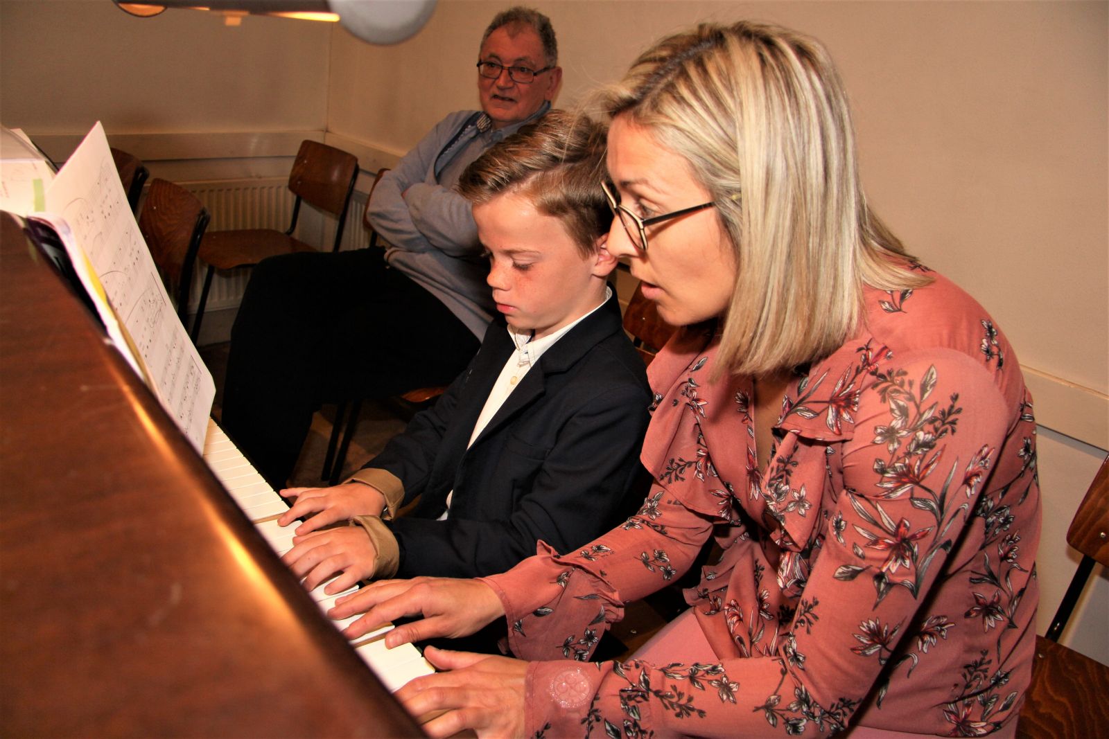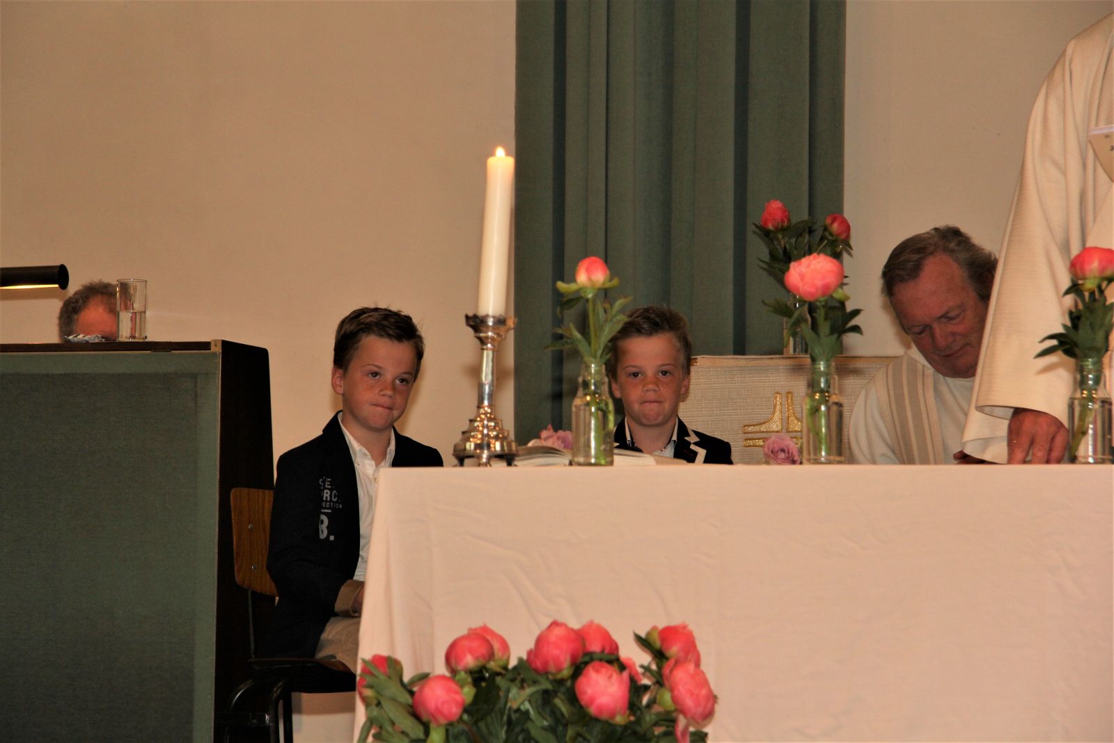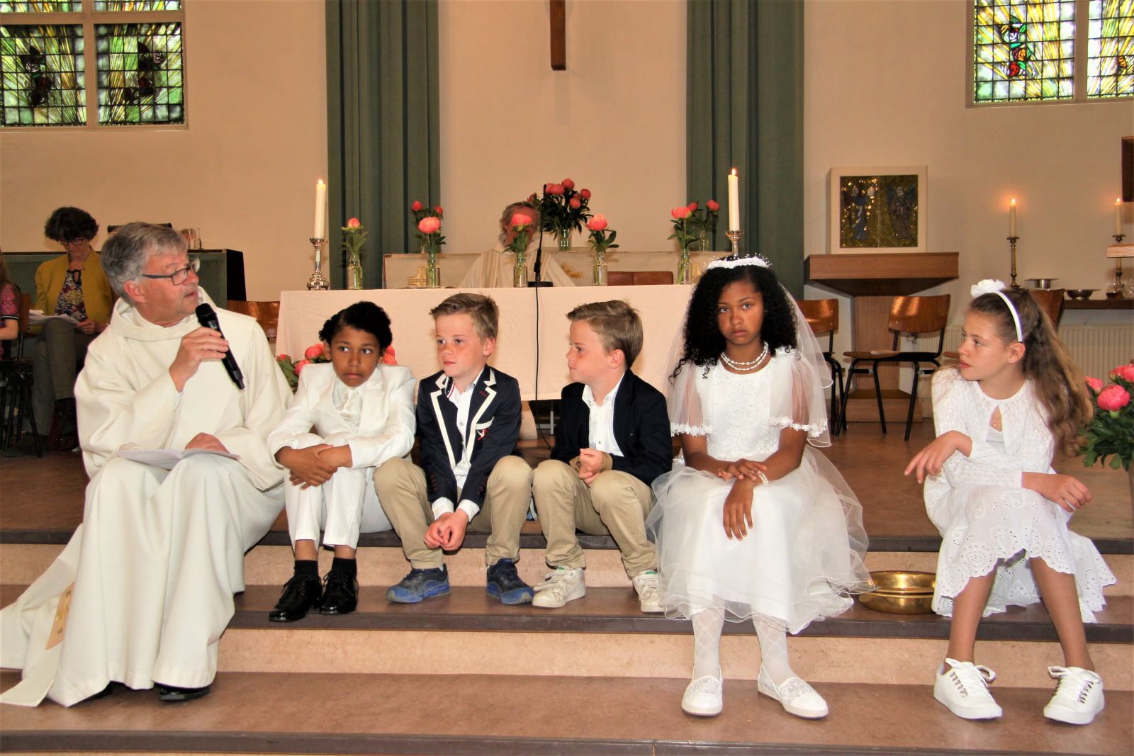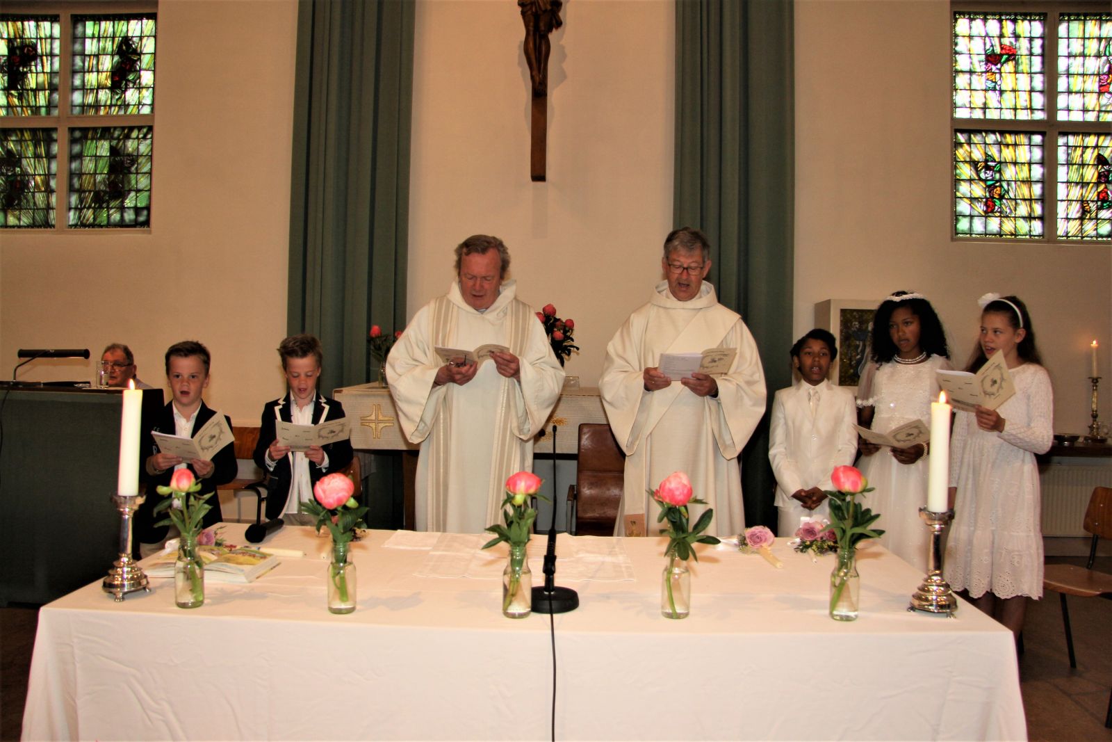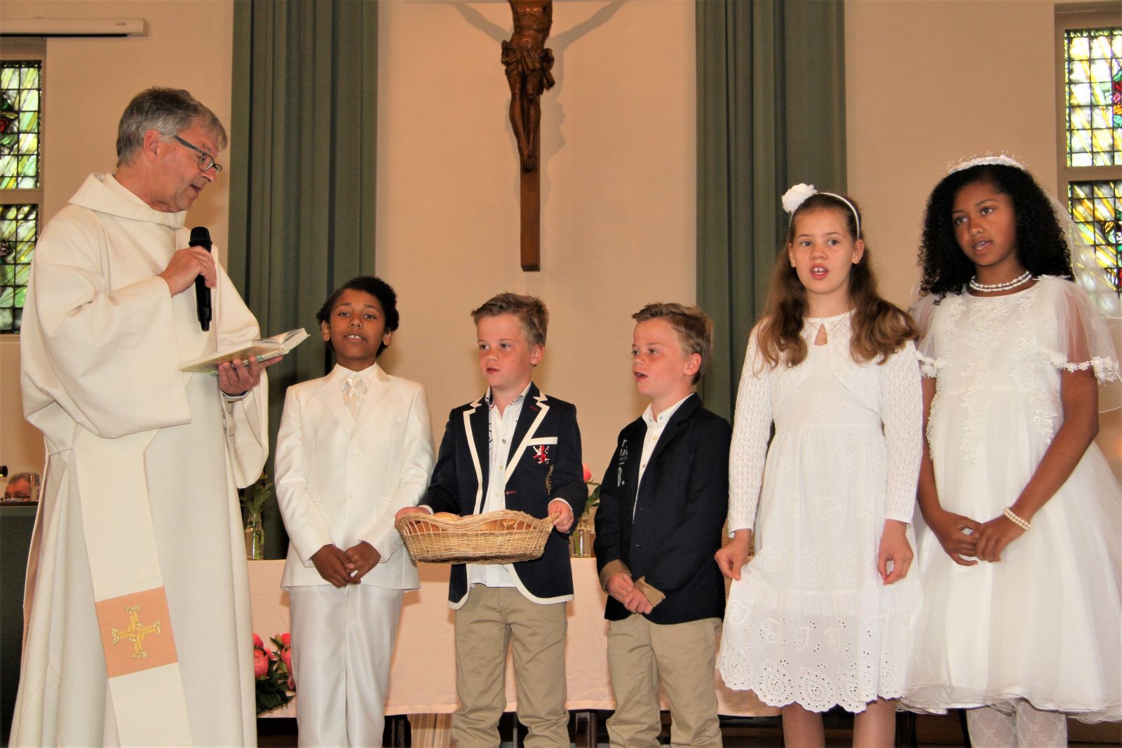 In de mooi versierde kerk die gevuld was met veel mensen is het voor de vijf communicanten een groot feest geworden. Alle vijf zagen ze er prachtig uit. De pastores Fons Litjens en Bernard Zweers gingen voor de in feestelijke viering die een aantal verrassende momenten kende. Zo hadden de communicanten een actieve rol tijdens het lezen van het evangelie over de vijf broden en de twee vissen. Na afloop daarvan deelden zij, gelijk de apostelen, brood uit aan de mensen. Verrassend was ook het moment dat Dico samen met zijn lerares op de piano een heus quatre-mains verzorgde. Pianist/organist Ad Jacobs van de Augustinusparochie keek bewonderend toe tijdens het moeilijke pianospel. Waarschijnlijk zag hij in Dico al een mogelijke opvolger. Voor de vijf kinderen en hun ouders was het een bijzonder moment toen zij uit handen van pastor Fons Litjens voor de eerste keer de communie kregen.