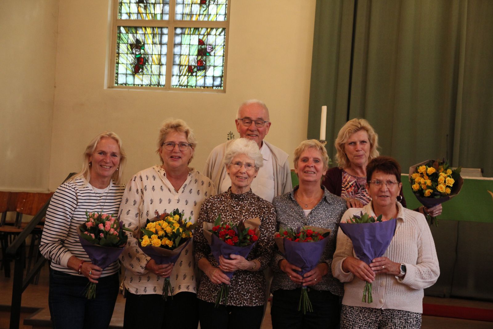 Stevig gaan ze ook op elkaar voor de zes dames die de dag tot in de puntjes toe hebben georganiseerd en verzorgd en als dank daarvoor in de bloemen worden gezet.