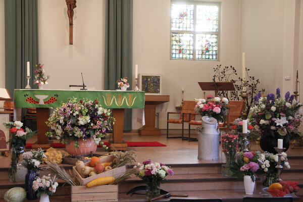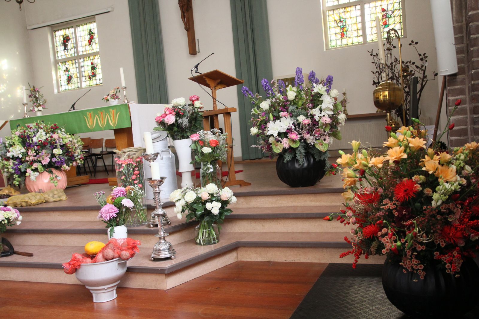 Oogstdankdag is ook een dag van saamhorigheid en extra aandacht voor elkaar. Daarom ook dat de kerkgangers na afloop van de viering bloemen mee naar huis nemen. Voor zichzelf, maar ook om te delen met anderen. Zoals ook vrijwilligers van de parochie bloemen brengen naar zieke parochianen en andere mensen in het dorp die wel een steuntje in de rug kunnen gebruiken.